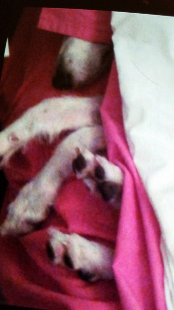 Hounds may have issues with their feet and particularly their claws which can get caught while playing or running or (like Miss Millie) when trying to burrow a hole into Mama’s bed! Breeders often cut the dew claws off to prevent them catching and breaking repeatedly, but dew claws have a function, which is to stabilise hounds when turning during a run or other activity. (FYI, dew claws are on the inside of the leg, just above the paw). See picture of Millie’s paws below – can you spot the dew claw?